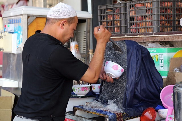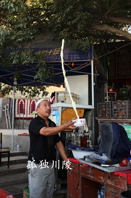 在喀什市中心老城區(qū)大清真寺門前,有一個(gè)賣酸奶的維吾爾人,他有一手絕活,能夠制作可口的酸奶冰(沙讓多克),喝他的酸奶,不僅僅是喝一碗酸奶而已,更是欣賞他的表演。