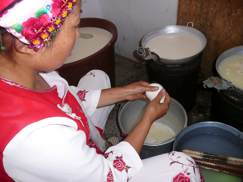 既然來(lái)源于蒙古傳統(tǒng),那大理的乳制品——乳餅和乳扇,也帶上了游牧民族的色彩。我們來(lái)到了當(dāng)?shù)匕鬃寰用窦抑校私馊樯鹊闹谱鬟^(guò)程采集發(fā)酵樣本。