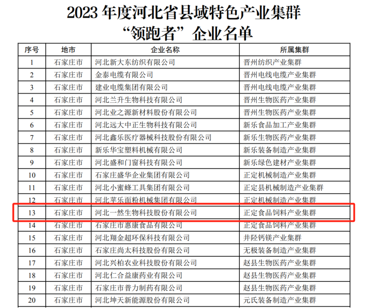 河北一然生物科技股份有限公司榮登2023年度河北省縣域特色產(chǎn)業(yè)集群“領(lǐng)跑者”企業(yè)名單。